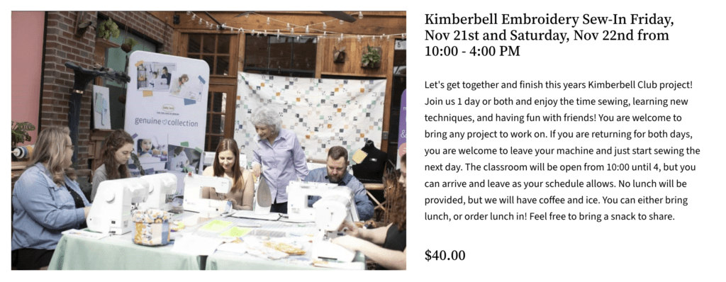 Try incorporating more crafting mixers into your store’s schedule. Thimbles Quilts in Illinois hosts monthly UFO sessions, inviting quilters to come in and finish their projects, and dedicated sew-ins like the one seen above, for Kimberbell. These events gather attendees at a low price point in an open classroom to finish projects, socialize, and lean on one another to figure out problems and get things done. The mood is always relaxed, open, friendly, and inviting for new and established customers.