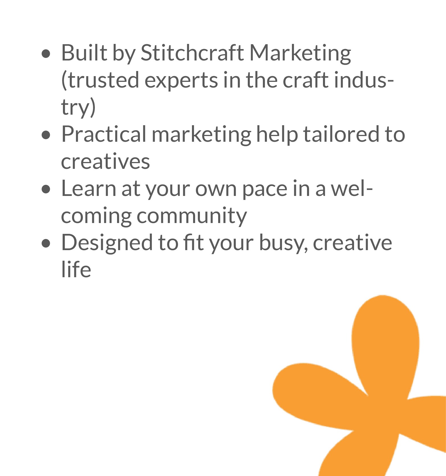 A monthly membership community on Skool, designed specifically for creative business owners. You’ll get expert marketing guidance, peer support, and exclusive resources to help your craft business grow.