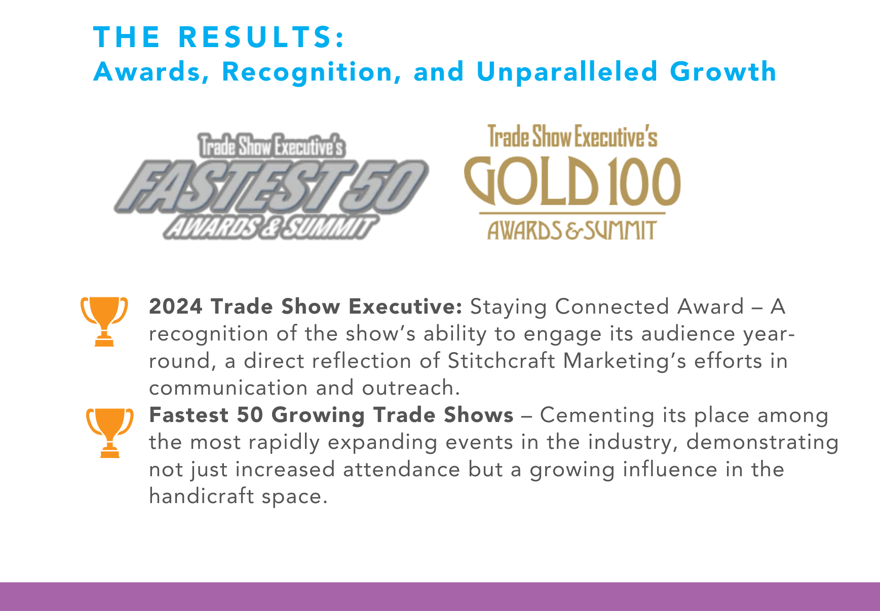h+h americas received the 2024 Trade Show Executive: Staying Connected award, a recognition of the show’s ability to engage its audience year-round, a direct reflection of Stitchcraft Marketing’s efforts. h+h americas is also recognized in the 50 Fastest Growing Trade Shows, cementing its place among the most rapidly expanding events in the industry, demonstrating increased attendance and influence.